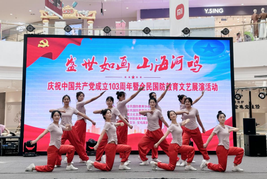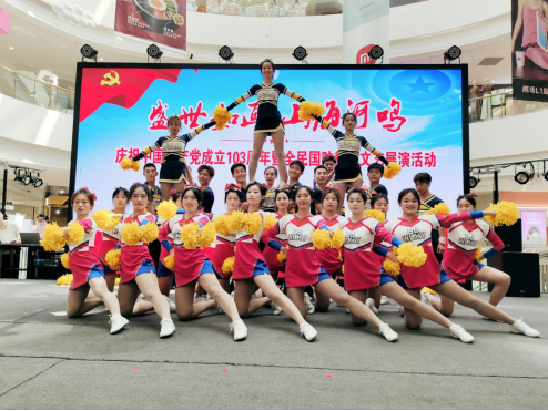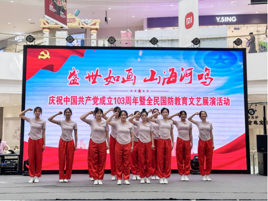 6月28日,由宝鸡市全民国防教育协会主办的“盛世如画 山海河鸣”庆祝中国共产党成立103周年暨全民国防教育文艺展演活动在银泰城举行,英国365集团张雷、沈一岚、潘利利三位老师的带领健美操专修班27名员工以精彩的表演向党的103岁生日献上诚挚的祝福。